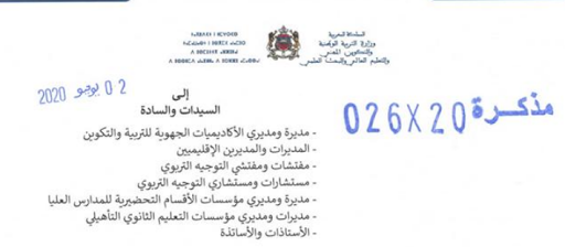مذكرة وزارية رقم 26 20 صادرة عن وزارة التربية الوطنية بتاريخ 02