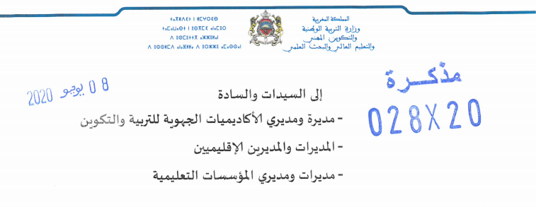 مذكرة وزارية عدد 028 20 صادرة عن وزارة التربية الوطنية بتاريخ 8